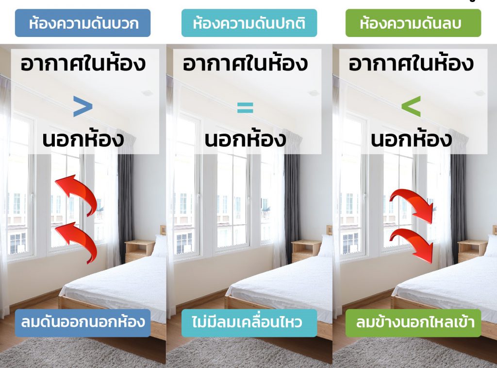 - ความดันลบ คือ อากาศในห้อง < นอกห้อง สังเกตุได้จาก ลมด้านนอกไหลเข้าสู่ห้อง